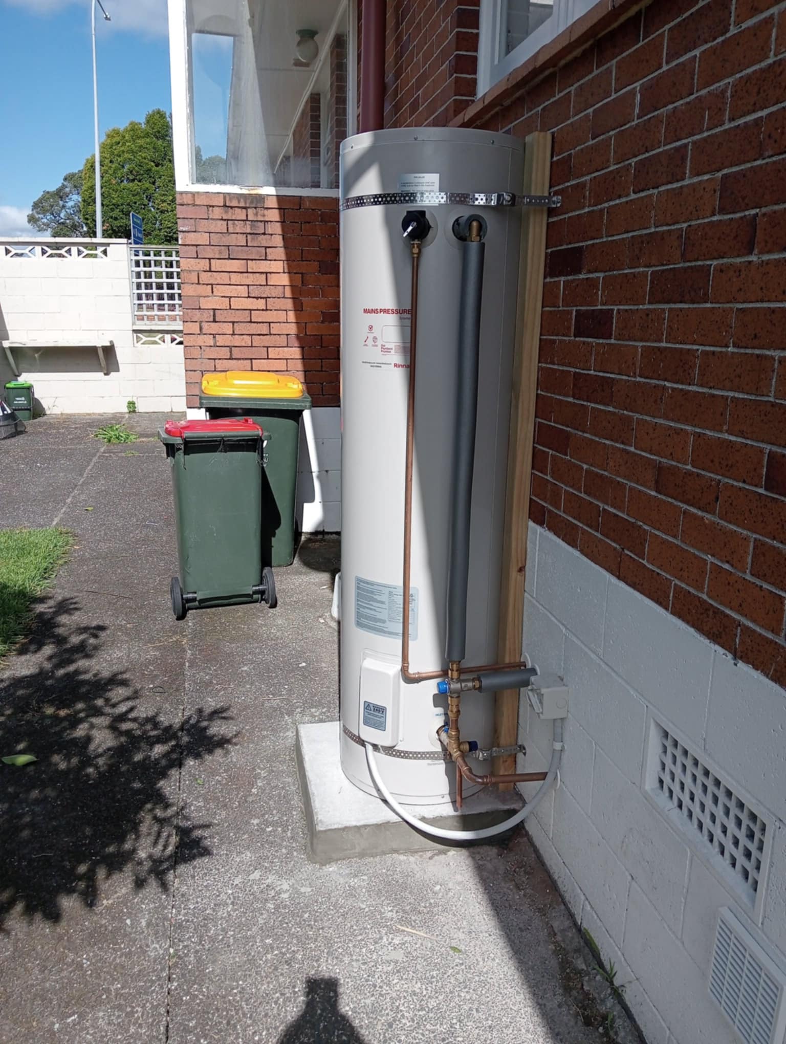 Complete hot water cylinder installation including indoor and outdoor units with professional copper pipework and compliance certification.